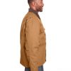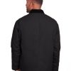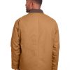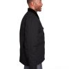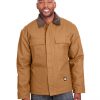 heavy-duty 10 oz./yd2 cotton duck; heavyweight quilt-lined taffeta liner; water repellent finish; Triple-needle stitched main seam; Heavy-duty brass zipper with storm flap; Collar snaps for optional hood; Two chest pockets with hook/loop closures; Pleated elbows and action back; Knit cuffs and waistband; Manufactured in a LEED (Leadership in Energy and Environmental Design) certified factory;